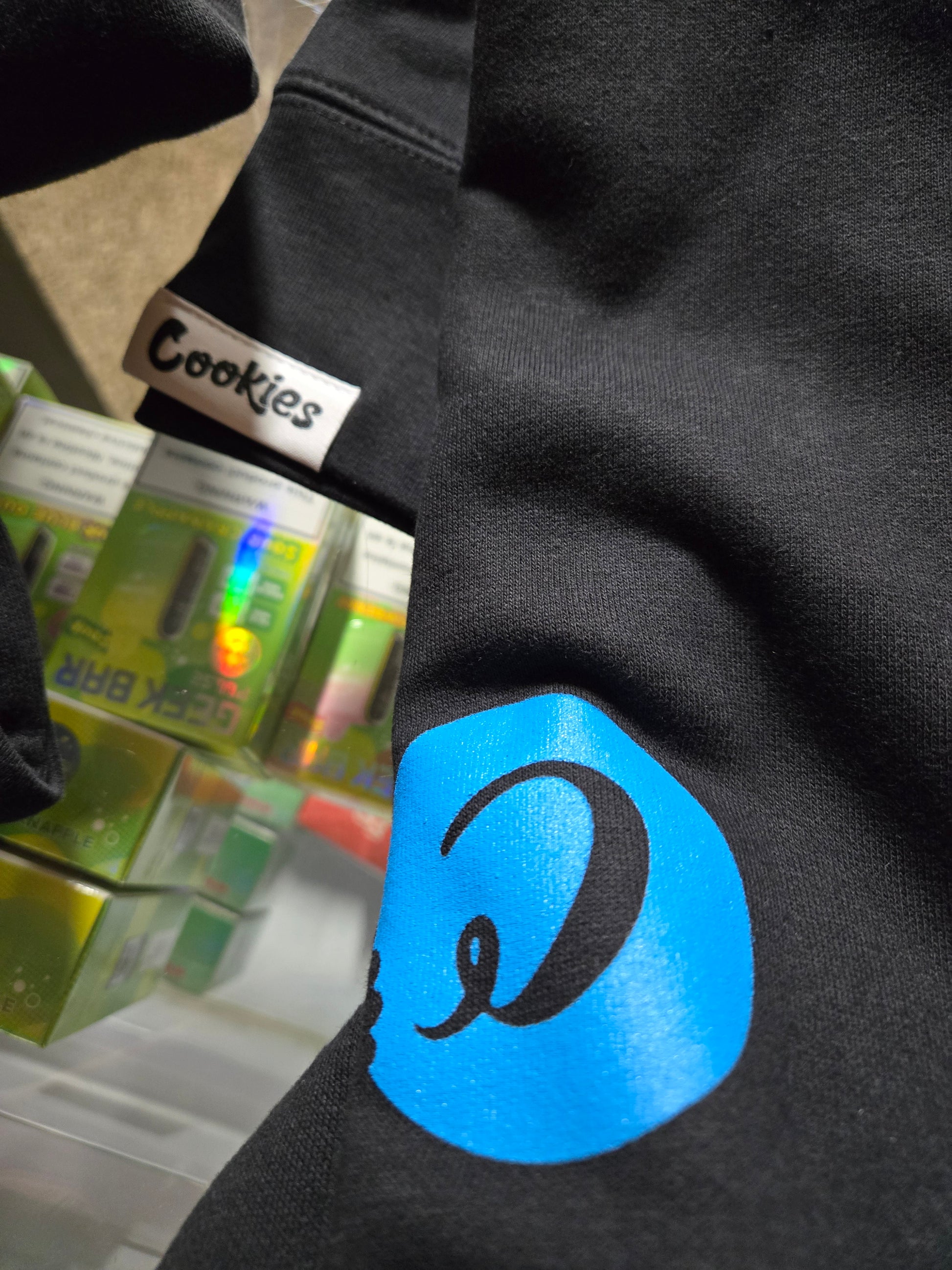 Expertly crafted for comfort and style, the Cookies Bite Zip-Up Hoodie features a classic black design with a bold blue logo. The convenient zip-up closure adds functionality to this authentic piece. Perfect for any casual occasion, this hoodie is a must-have for any wardrobe.
