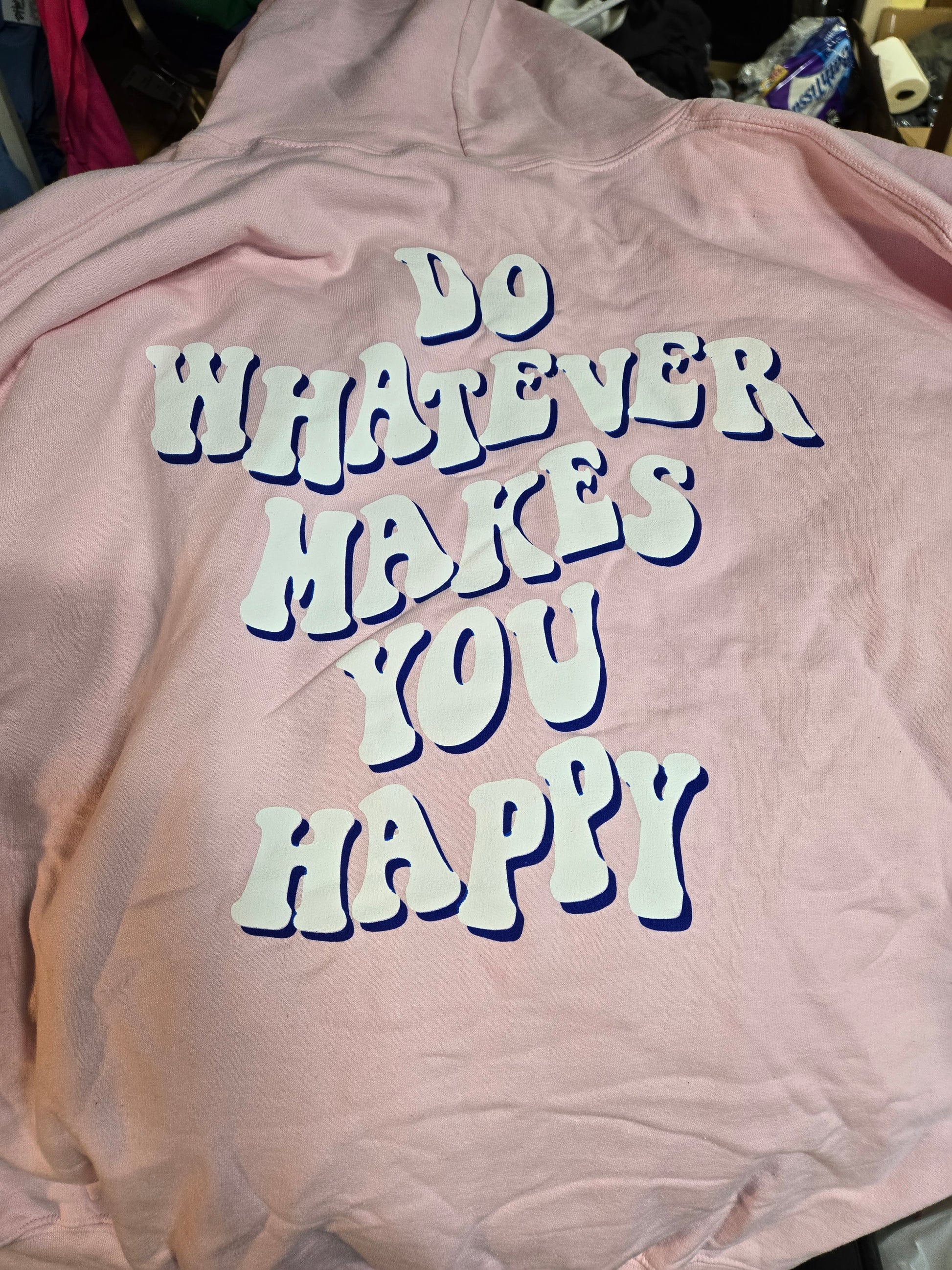 The Happy Hoodie is a stylish pink pullover featuring a unique front and back design. Made to provide comfort and fashion, this hoodie is perfect for any occasion. Its blend of design and functionality ensures a trendy and eye-catching look.