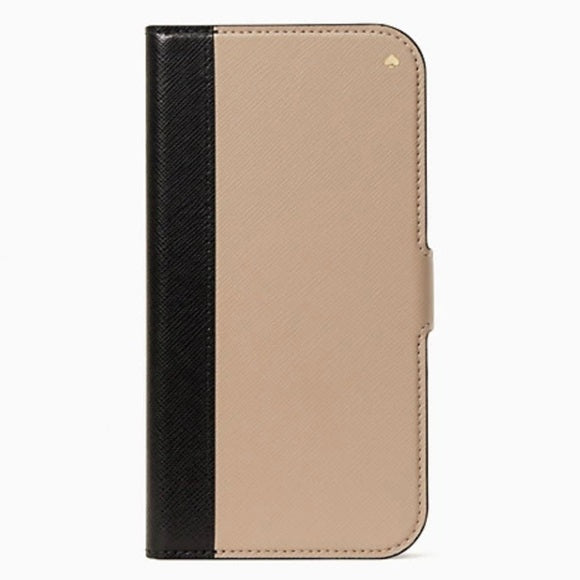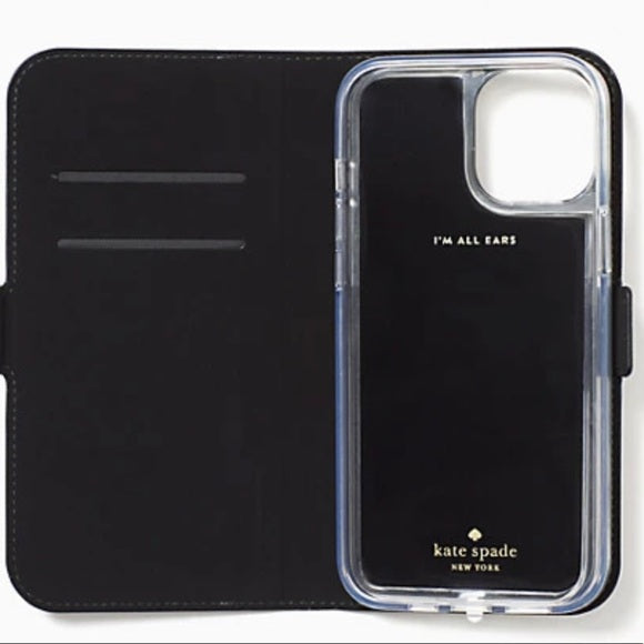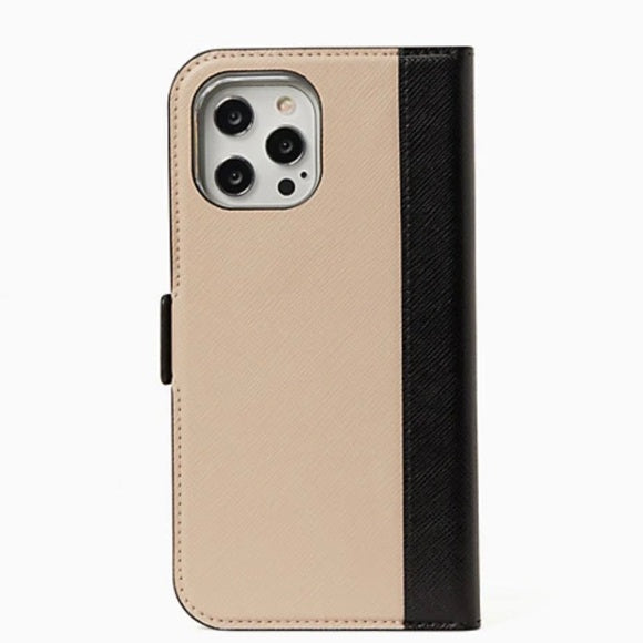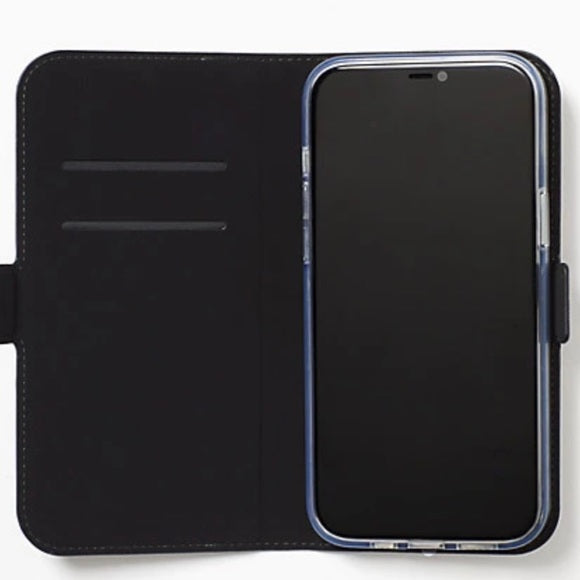 This magnetic wrap folio case, made of durable Saffiano material, features a velveteen lining and a magnetic closure to keep your iPhone 12/12 Pro secure. With two credit card slots and a KSNY logo, it's a stylish and functional accessory for your phone.