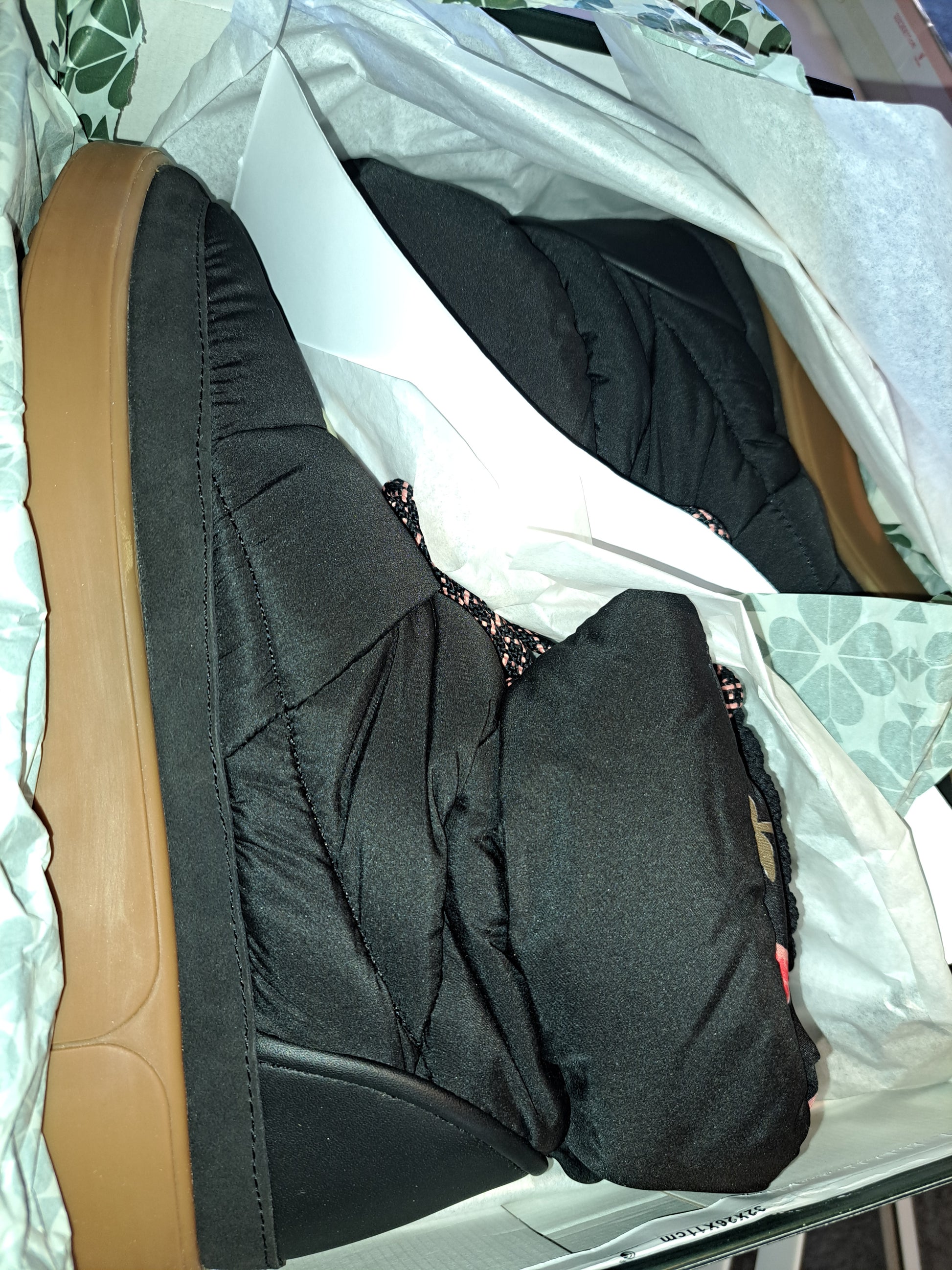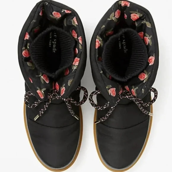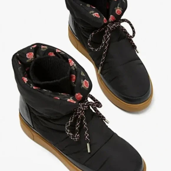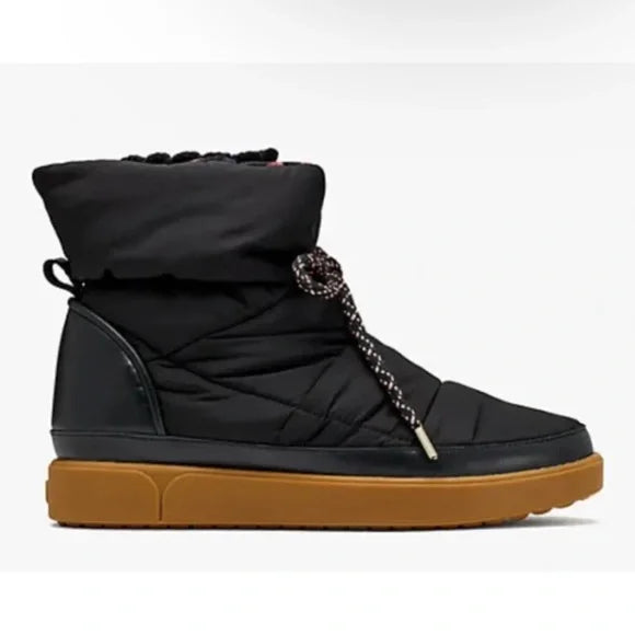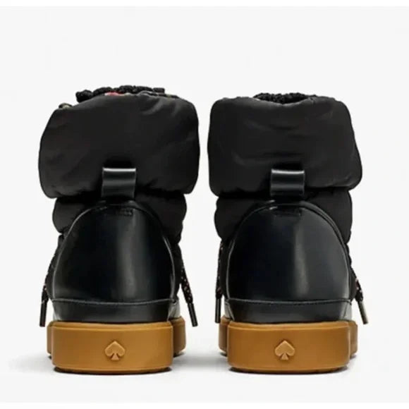 Stay warm and stylish this winter with Kate Spade Black Cocoon Snow Boots. Made with puffy tech fabric and cow leather, these boots feature an attached knit sock and nylon facing upper for extra comfort. A round toe and pull on design with laces make these boots both functional and trendy.